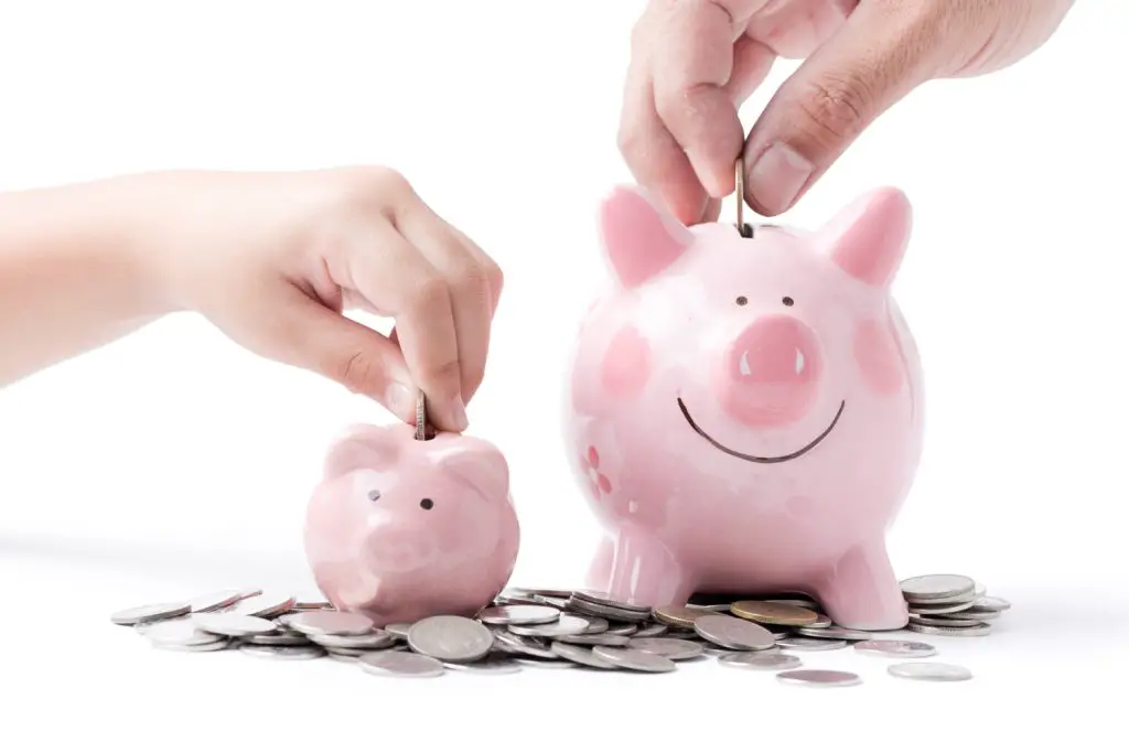 father and child hand put coin to piggy bank