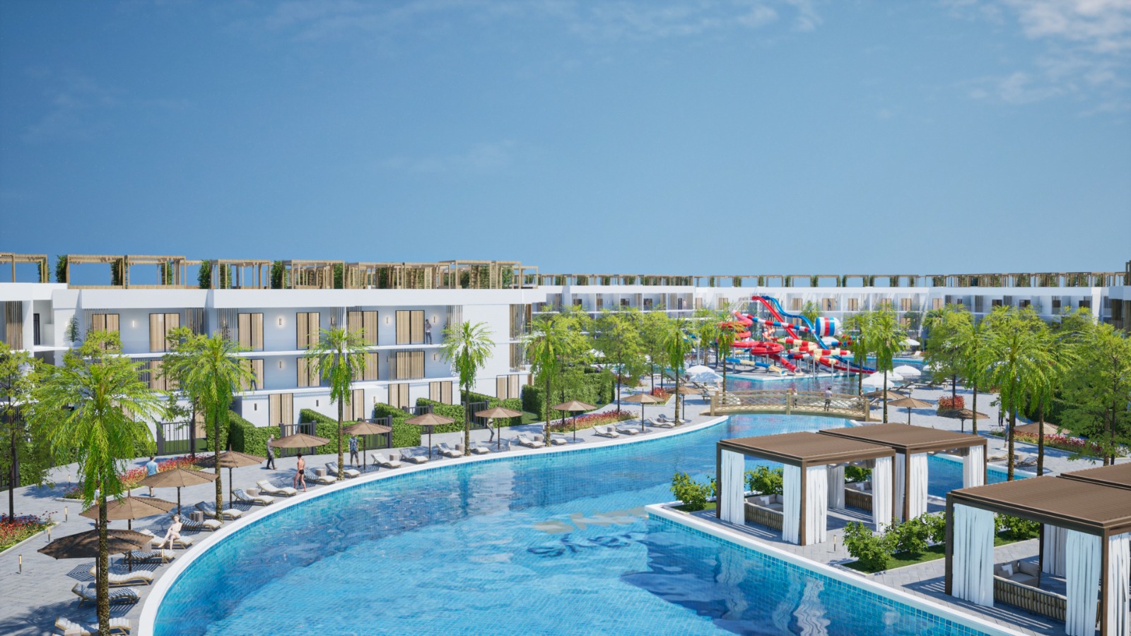 Aqua park with water slides, children’s zones, and sunbathing areas