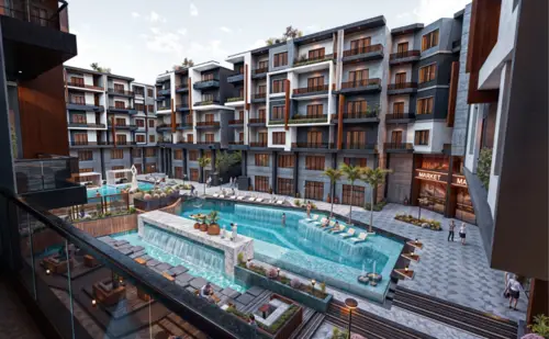 The project offers a range of fully finished units—studios to 3-bedroom apartments—many with pool or city views. Residents enjoy a wide selection of amenities, including two pools, a gym, spa, underground parking, 24/7 security, and a vibrant commercial boulevard with cafés, shops, and offices.