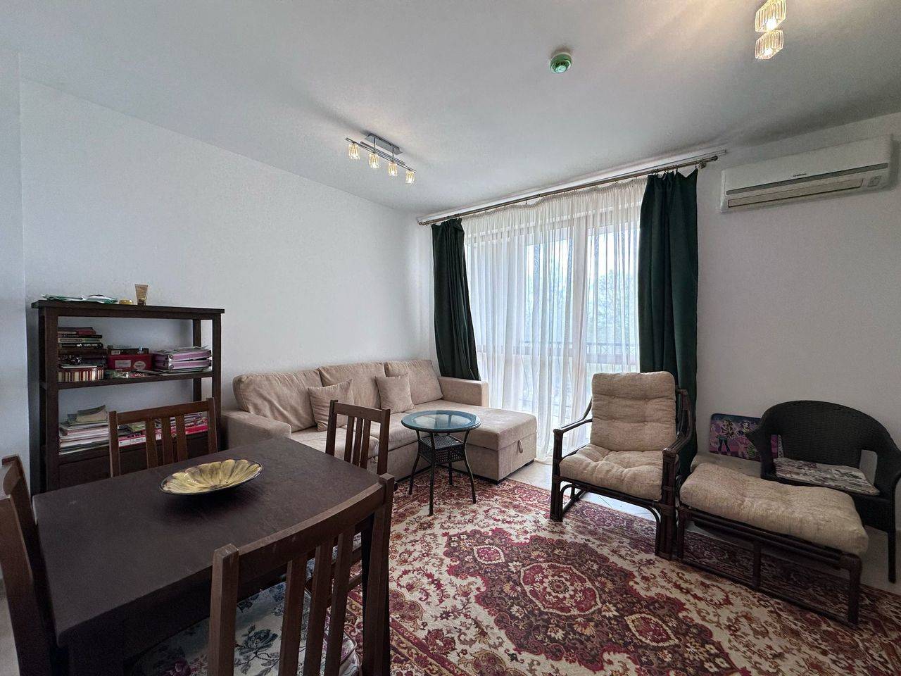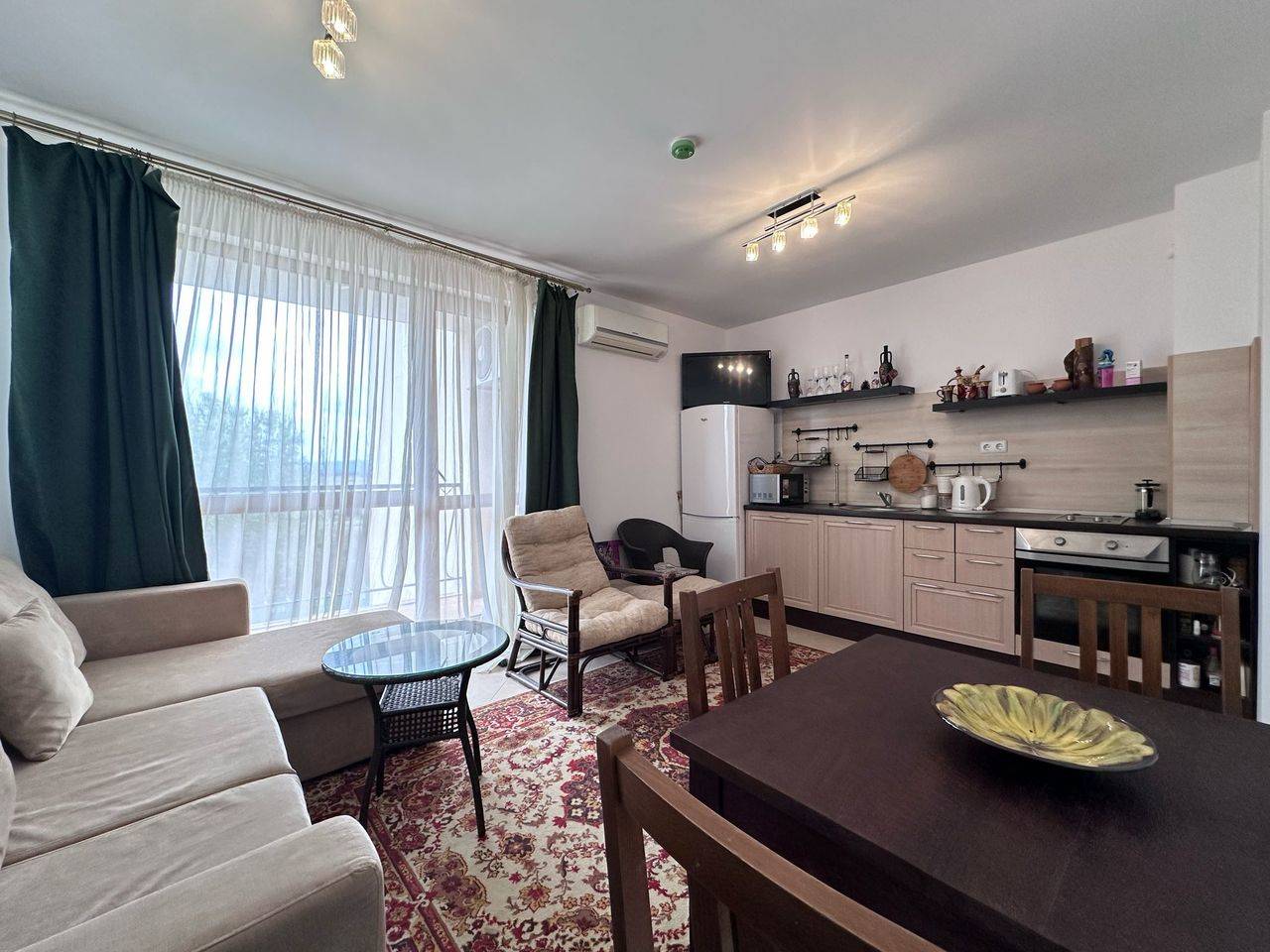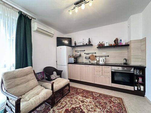 The apartment is 53 sq.m. and consists of an entrance hall, a living room with kitchen and dining area, 1 bedroom, a balcony with pool view and a bathroom with shower cabin, toilet and sink. The apartment is for sale fully furnished, ready to use or rent out.