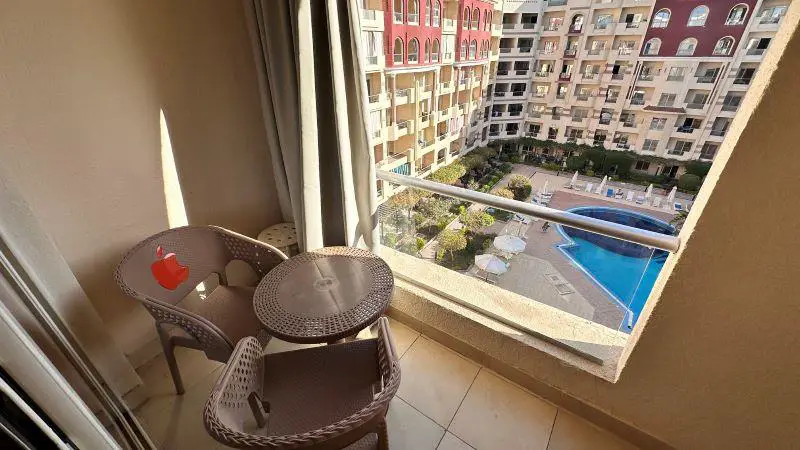 The windows and balcony are overlooking the main swimming pool of the compound.