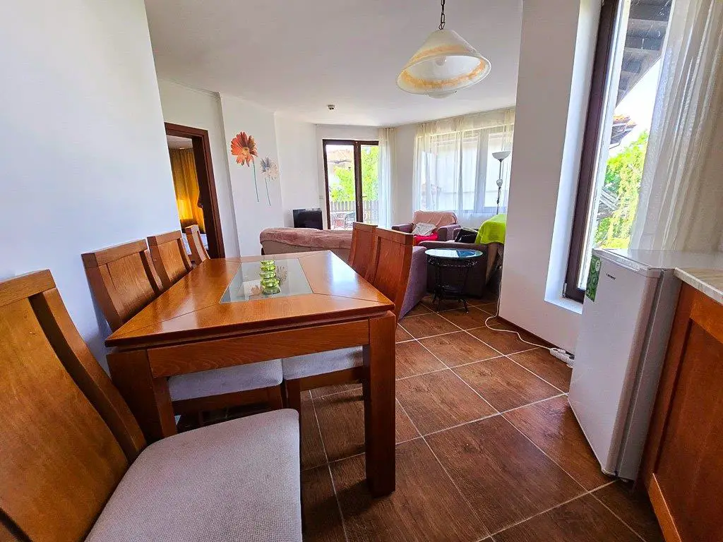 IBG Real Estates presents this spacious 2-bedroom apartment located on the ground floor in the prestigious Bay View Villas complex in Kosharitsa, just 2 km from Sunny Beach. Situated on a hill, the complex offers stunning panoramic views of the sea and the bay of Nessebar, Ravda, and Pomorie.