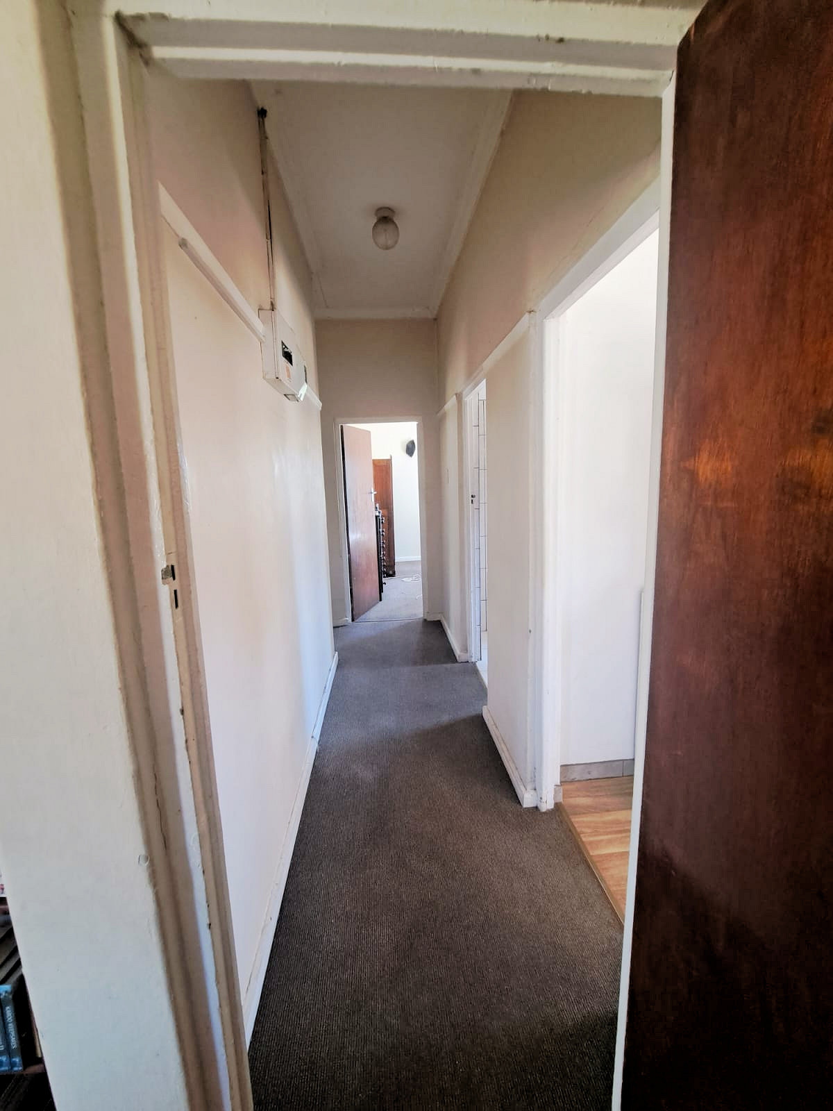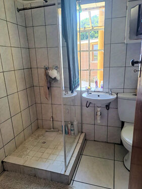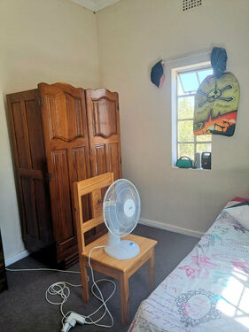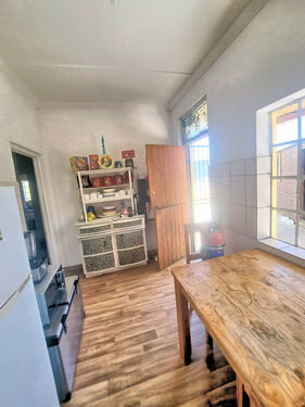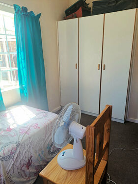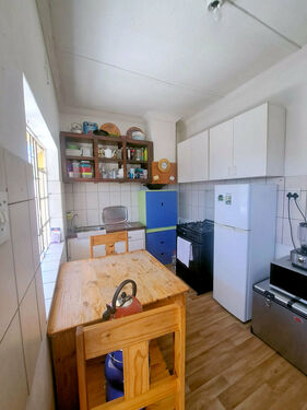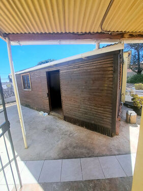 It has three bedrooms, one with wardrobes and all with carpets. The family bathroom has a shower, toilet and basin as well as tiled flooring. In the kitchen and living area there is laminated flooring. There is a single garage and wendy house which can be used for storage space.