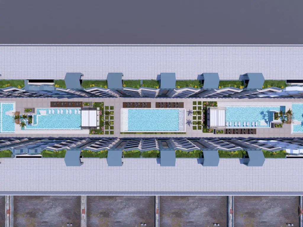 5 swimming pools (including a heated pool and 2 rooftop pools with panoramic views) - modern reception area + 24/7 security - integrated cctv system - central shower system - cafes and restaurants + retail shops