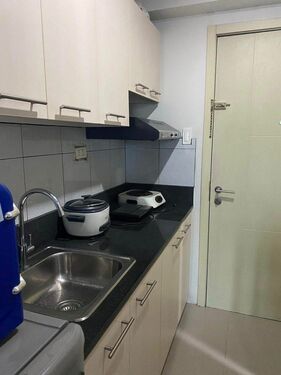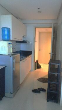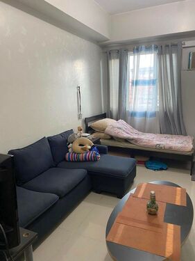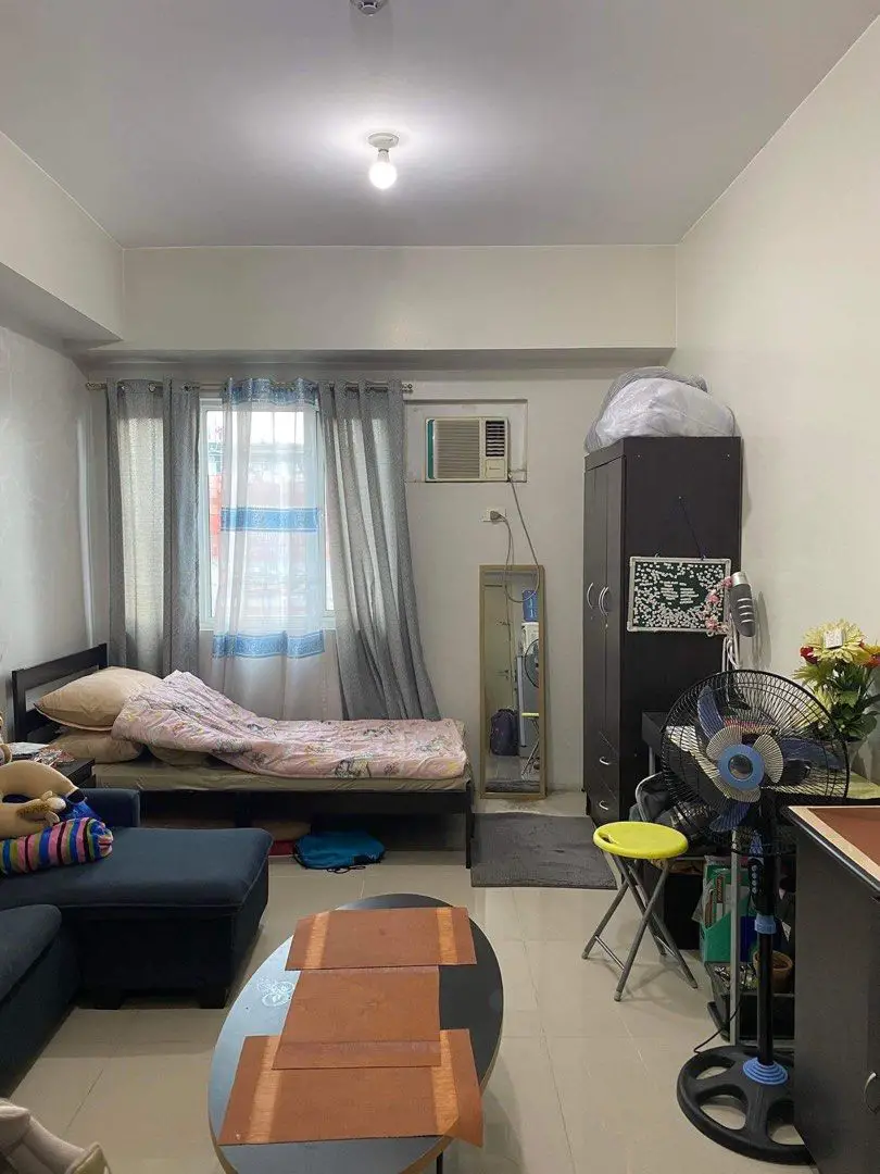 Studio Unit. Floor Area: 23 sqm. Fully Furnished with a sofa, cabinets, single bed, tables, refrigerator and other kitchen necessities