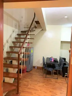 1 Bedroom (Loft Type). Floor Area: 42.33 sqm. Fully Furnished with laminated wood flooring for living, dining, kitchen and bedroom, ceramic tiles for toilet, painted plastered cement for living, dining, kitchen and bedroom, combination of ceramic tiles and painted plastered cement for toilet, painted slab for kitchen, living, dining, bedroom and toilet, granite countertop kitchen with lower and overhead cabinet, 4-seater glass dining table, 3-seater L-shaped sofa, shelve, microwave oven, refrigerator, 22"LCD TV with DVD player and rack, electric fan, range hood, bed frame with 6" foam, console table with chair, bedroom closet, 1.5HP aircon, electric fan, fiber glass shower enclosure with shower heater