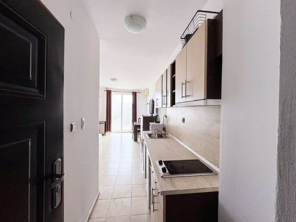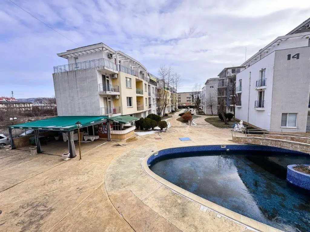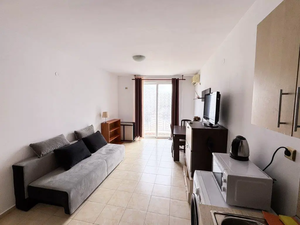 The complex is situated only 900 meters from the beach (about a 10–15 minute walk) and just 500 meters from the center of Sunny Beach, providing easy access to shops, restaurants, supermarkets, and entertainment.