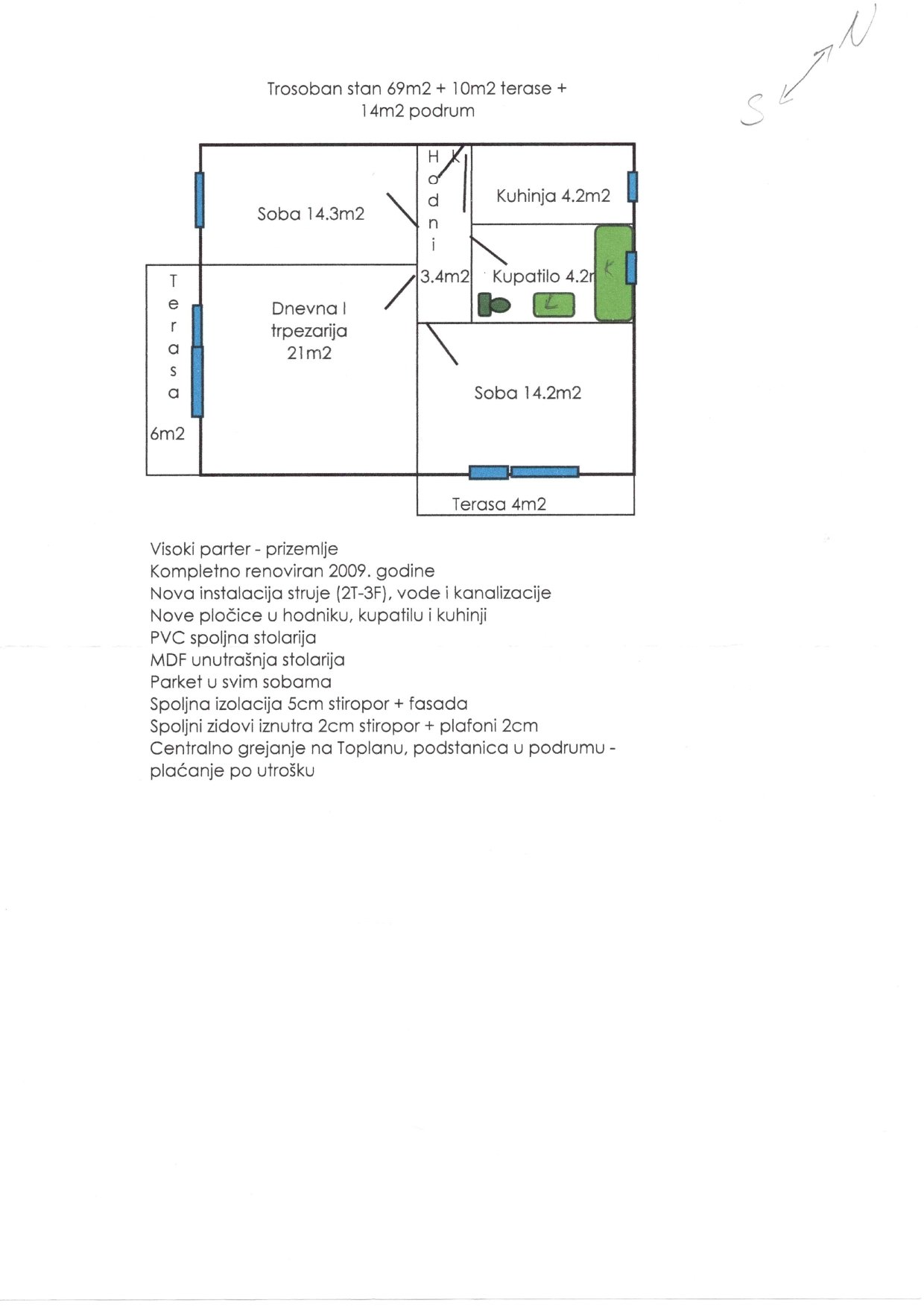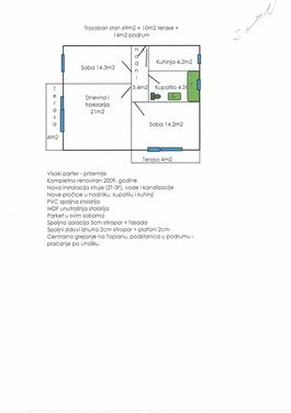 Excellent three-room apartment in the quietest part of Bečej, Sever Đurkić. Ground floor - high ground floor. Completely renovated, new installations, ceramics, PVC exterior and MDF interior carpentry. Sandwich wall insulation. 69 m2 registered, plus two terraces 6m2 and 5m2, and a basement 14m2. Use of the bicycle shed, parking in front of the building. New inverter air conditioner, under warranty. Heating from the heating plant, BUT with a substation in the basement - you pay for what you use, not a fixed price per m2. Cat. lot 1586, owner 1/1 no encumbrances. For more information, contact me at +381692115350.