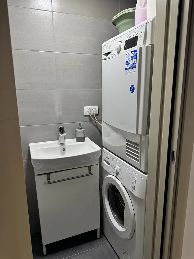 The apartment has built-in wardrobes up to the ceiling, with deep and wide shelves and hanging parts: