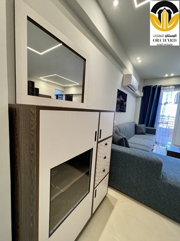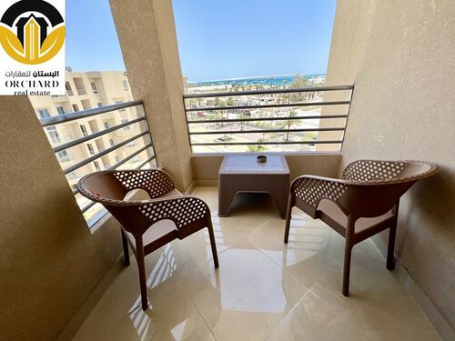 Living area with open plan kitchen leads to the balcony overlooking the Red Sea and swimming pool area, two bedrooms and the bathroom are completing this furnished apartment.