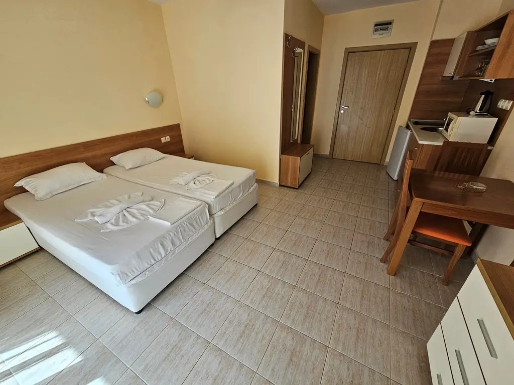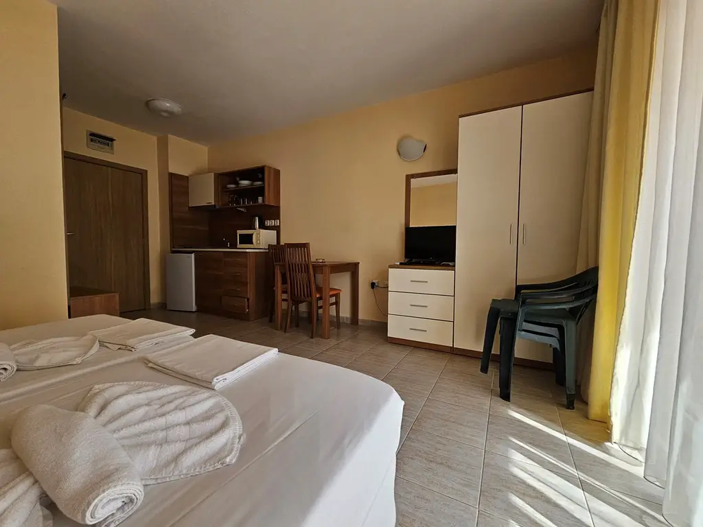For sale is this furnished studio in Excellent condition located in complex Pollo Resort, Sunny Beach. The complex is located at about 500 meters from the popular Cacao Beach area and at 2 km from the old town of Nessebar. Pollo Resort has a big outdoor swimming pool with section for children, pool bar, lift, parking, security, reception, gym and SPA.