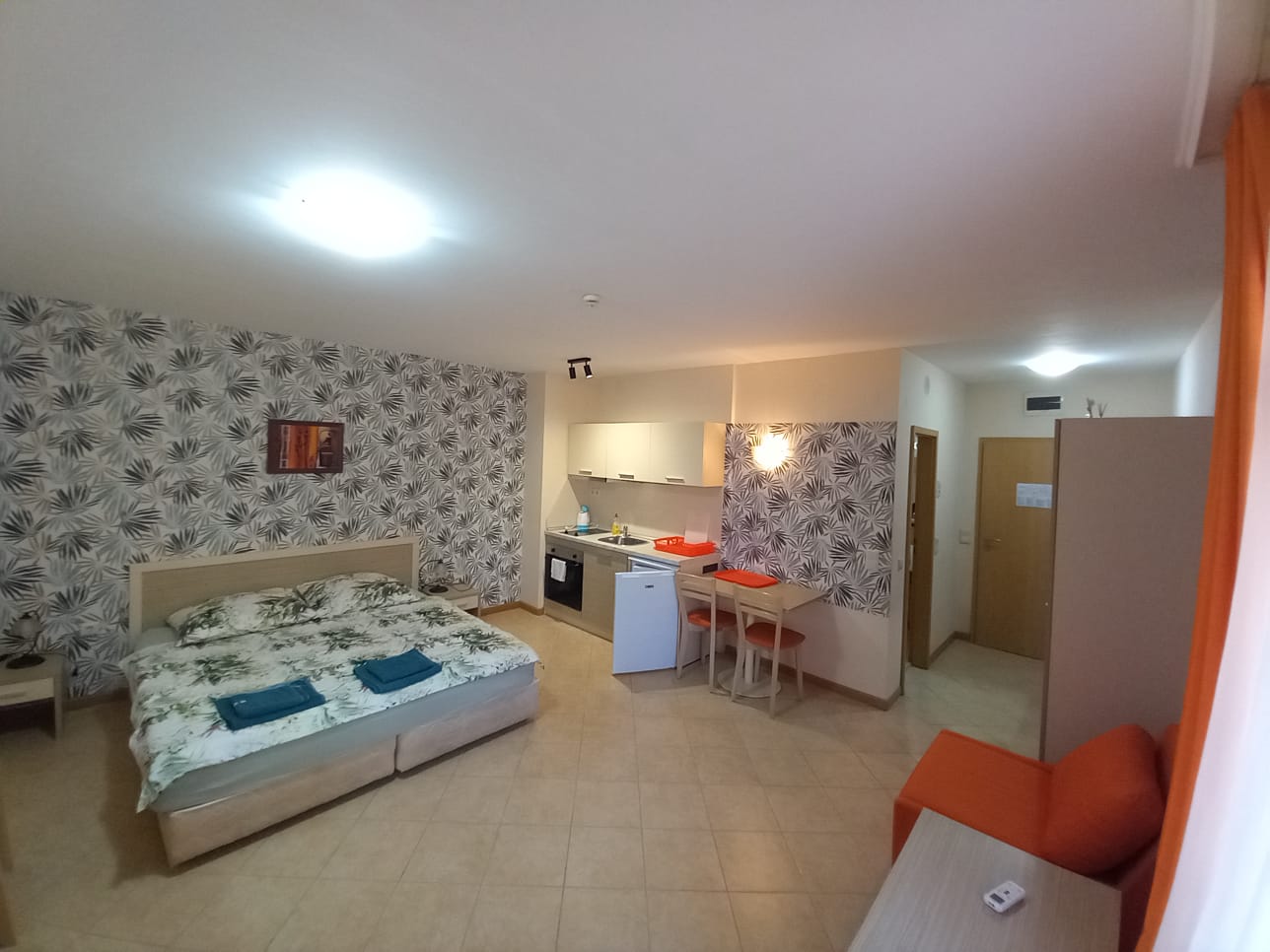 Open-plan living room with kitchen and sleeping area