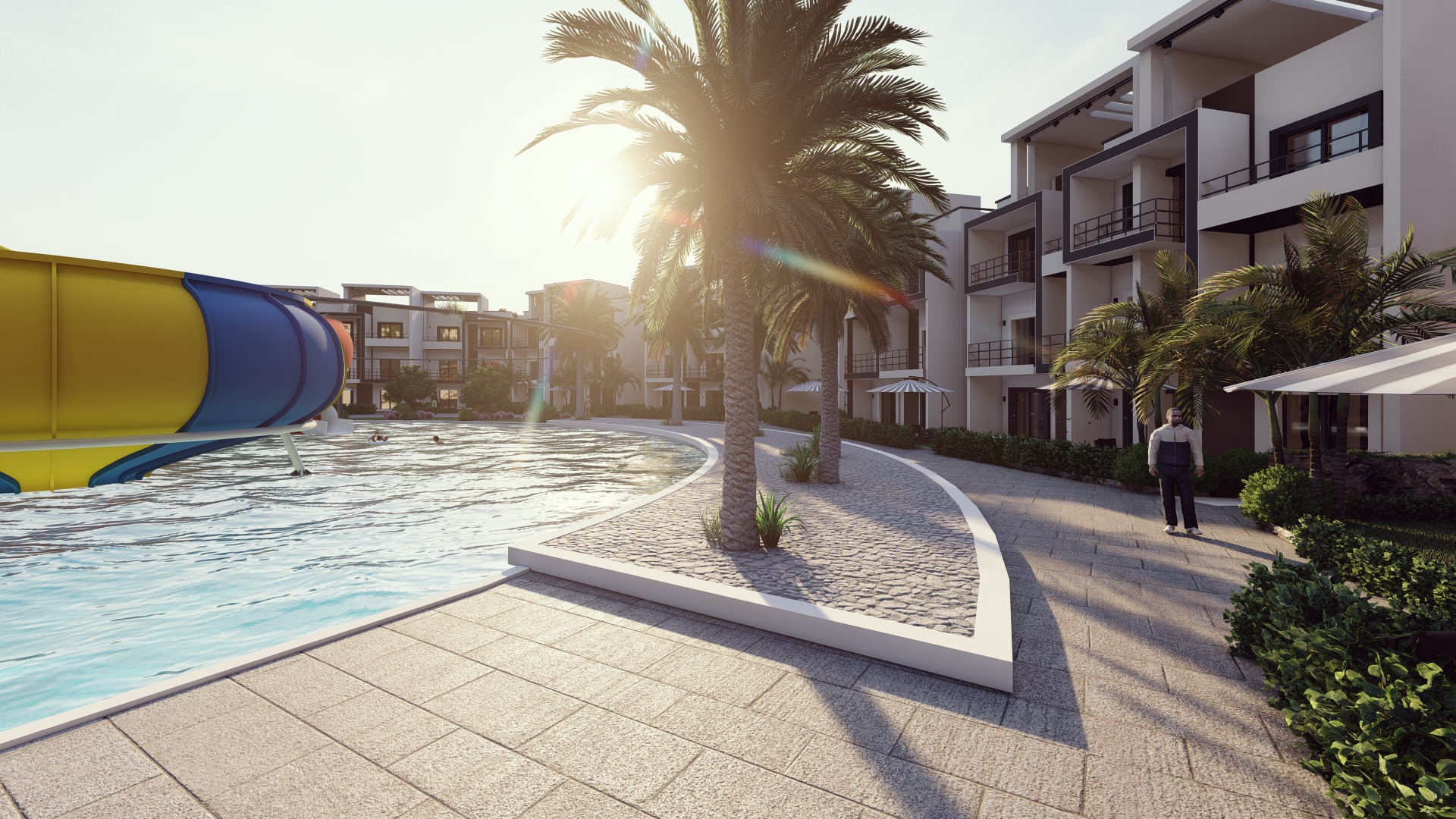 Stunning views of green spaces and swimming pools