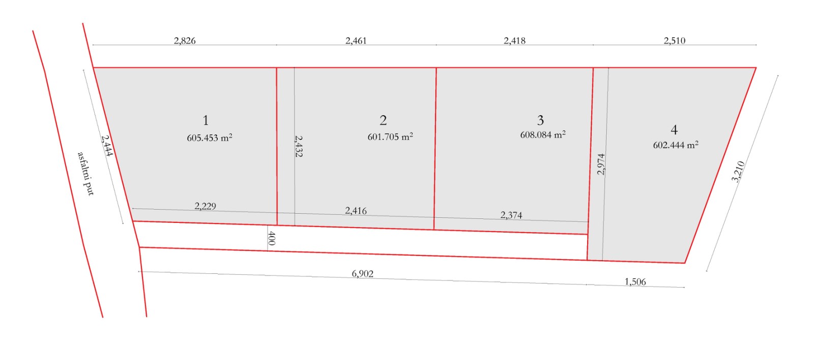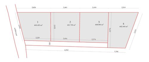 The plot is subdivided as shown in the picture. There are 4 plots of 6 ares each.