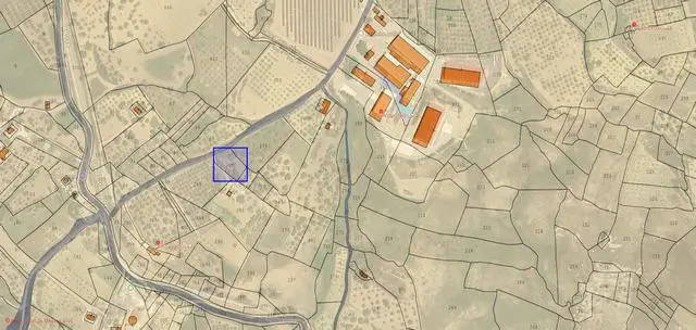 The land is located about 1 km from the village, adjacent to a country road. It includes an olive grove of approximately 25 trees covering a total area of approx 2,000 square meters.