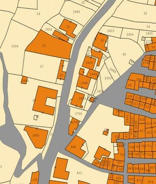 This is a small plot of land with the plan dimensions of 7.50 x 22.50 m which can be used either as a garden due to its proximity to the town or as a building lot.