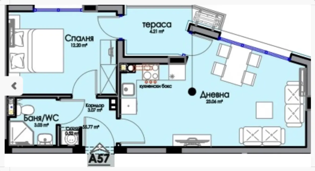 We present apartment A57, located on the seventh floor of the residential building SKARABEY TORTUGA, a modern development by the construction company SKARABEY BUILD, situated in the fast-developing Horizont district of Burgas.