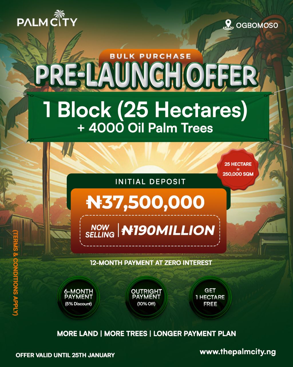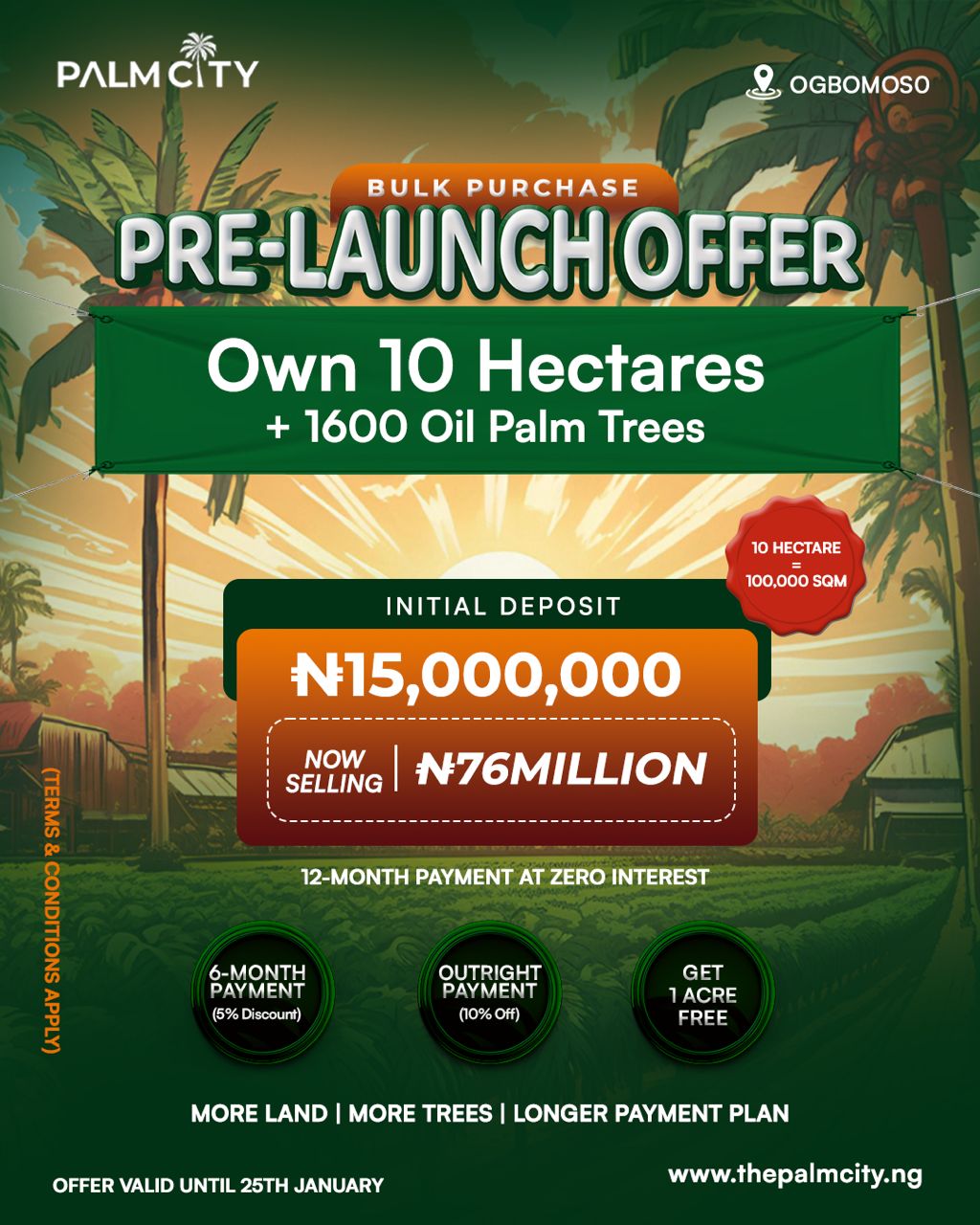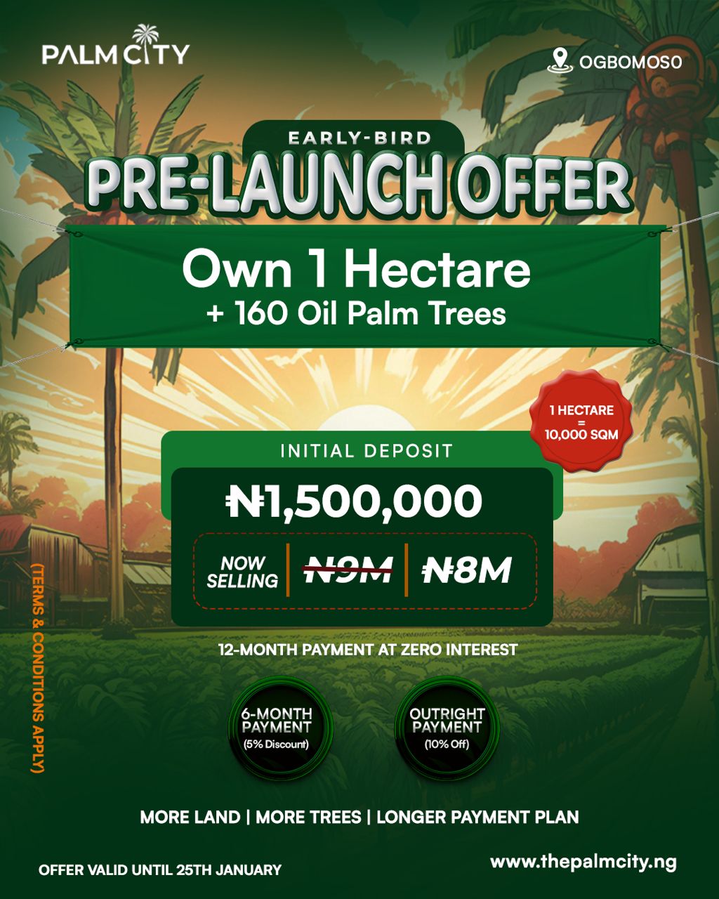 The second phase of the Palm City project is now in the market at the pre-launch price. The pre-launch offer is valid until January 25th to secure a spot at Palm City Ogbomoso.