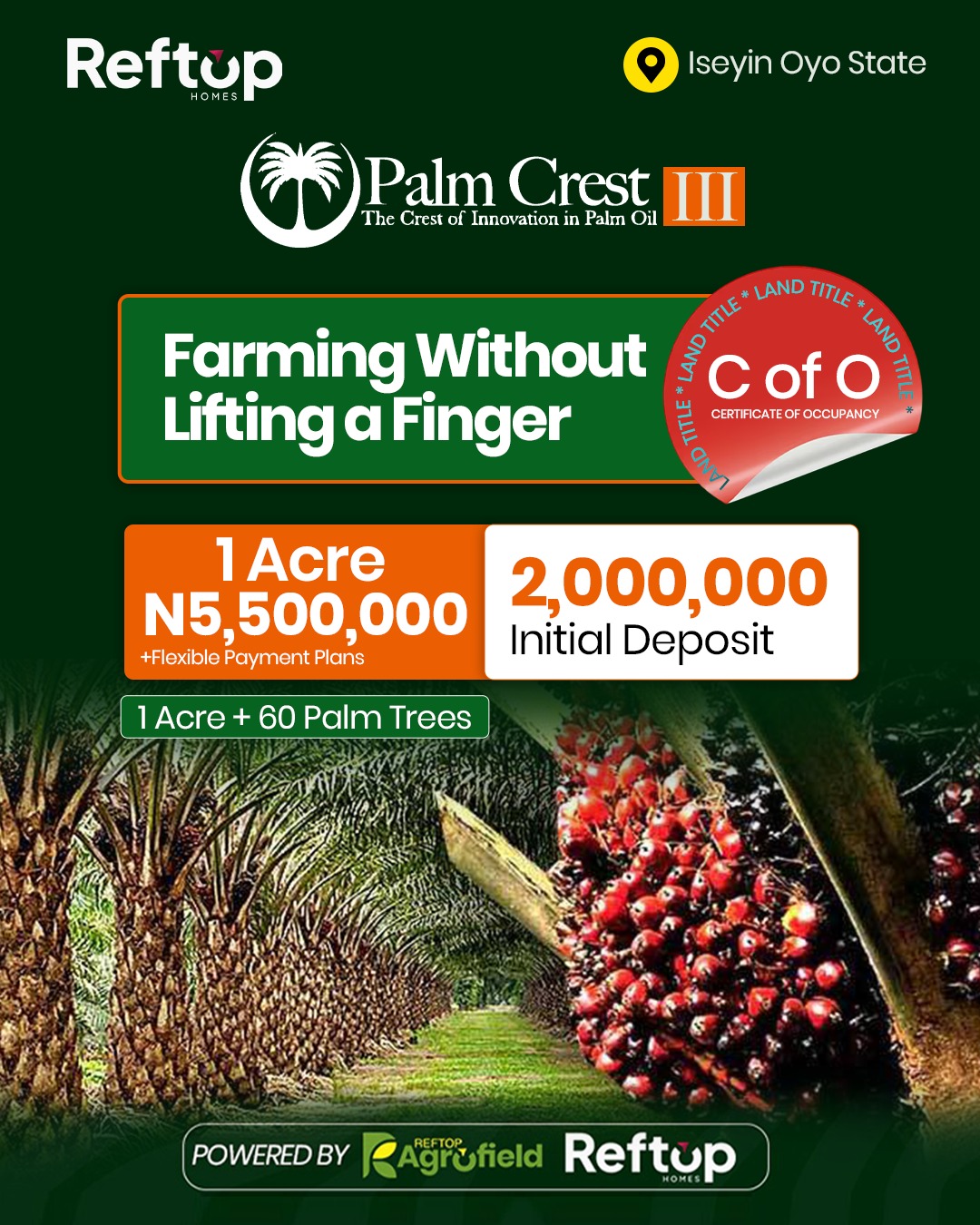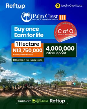 PALM CREST PHASE 3, ISEYIN OYO STATE A flagship agro-real estate project combining land ownership with structured palm plantation investment. At Palm Crest, investors own titled farmland while operations from planting to harvesting are professionally managed, creating a passive, long-term income stream tied to Nigeriaโs growing palm oil demand. Own a Piece of Nigeriaโs Thriving Palm oil Industry! THE STRUCTURED AGRICULTURAL ASSET Palm Crest Phase 3 represents the next evolution in structured agricultural ownership. It combines: - Titled farmland ownership - Professional plantation management - Integrated processing infrastructure - Commodity-linked returns - Long-term generational asset creation - Own the land, own the plantation & own the produce This is not; - Speculative farmland - Pooled crowdfunding - Fixed-return agricultural marketing