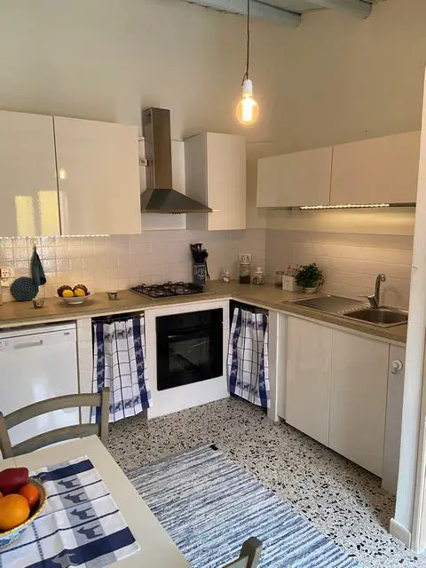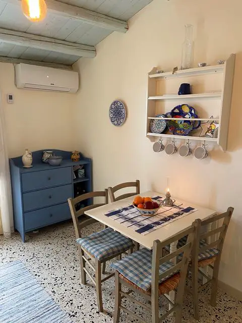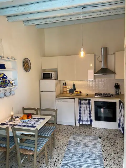 Top floor comprises a fully equipped kitchen in rural style with dishwasher, gas stove, electric oven modern cupboards and air condition unit, directly opening to a roof terrace facing south. Both kitchen and terrace is large enough for a dining set for the perfect indoor/outdoor living