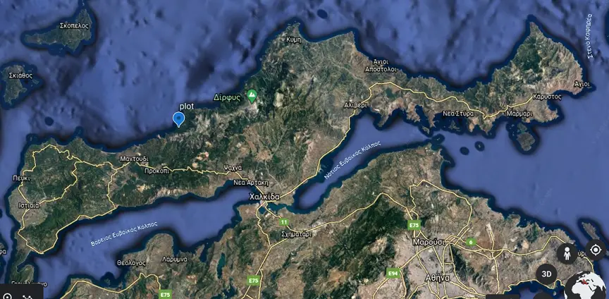 For sale extraviral land at sea on the island of Euboia in Greece. The land is located in Vlahia Pili region, 500 meters from the sea and 2 km from Vlahia. Nearby (500 m) there are two very picturesque beaches and in the region there are many beautiful beaches opening to the Aegean Sea (from the beach , in the distance you can see the islands of Skiathos, Skopelos and Alonisos). An easy construction can be done on the land or mobile house can be put. It is easy to connect to the water supply network.