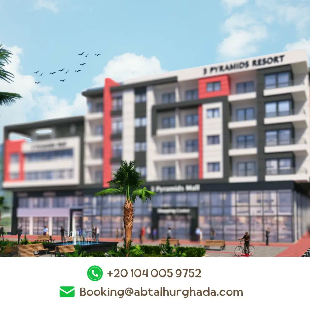 At 3 Pyramids Resort – prime location in Al Ahyaa district, directly in front of Sunrise Hotel on the Tourist Promenade, just 2nd row from the sea