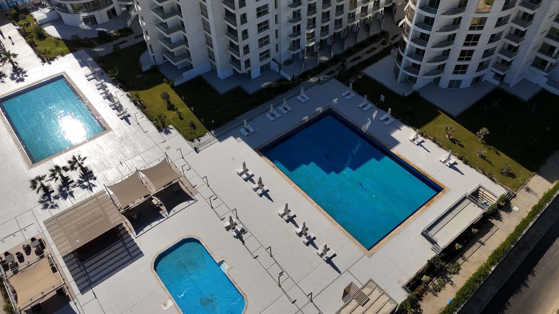 Three swimming pools surrounded by landscaped gardens