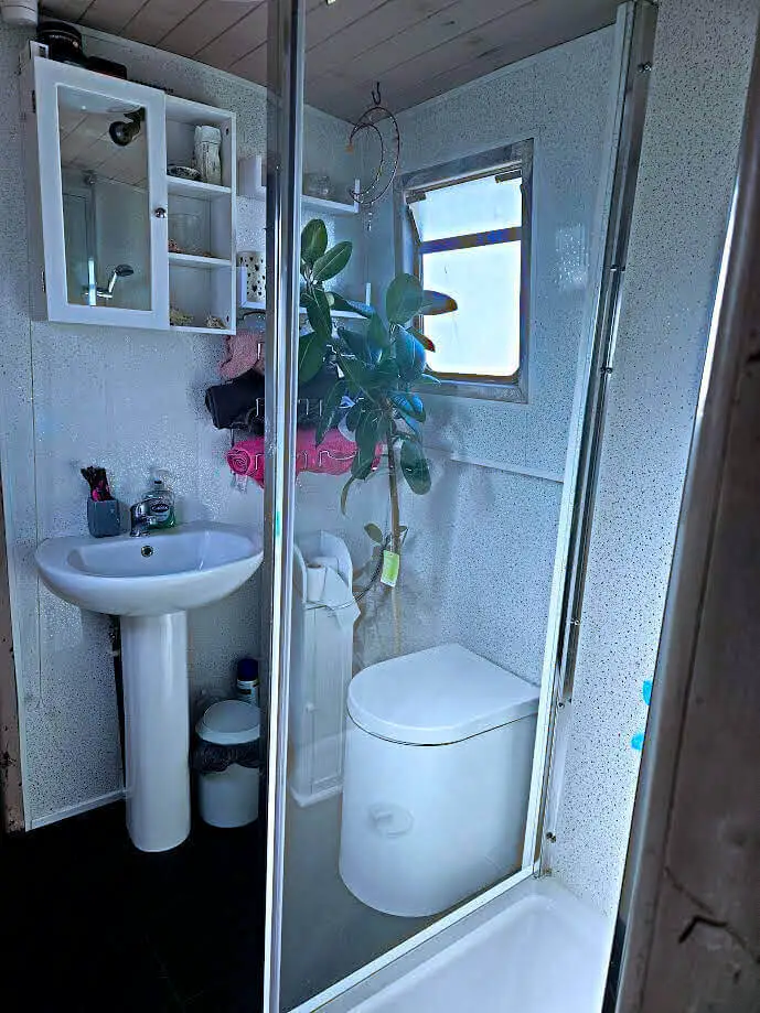 Bathroom: Centrally positioned, fitted with a good-sized shower cubicle, composting toilet, and hand basin.