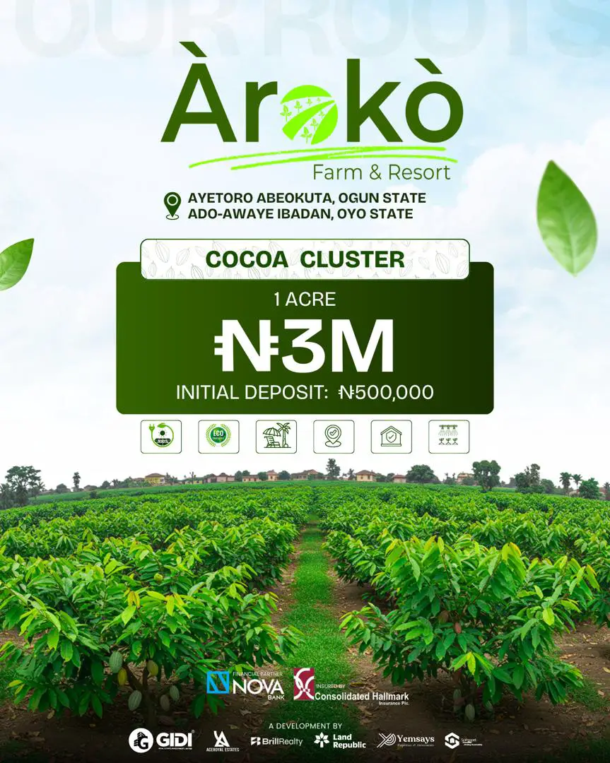 This isn’t ordinary real estate. At Àrokò, every acre is profit + paradise. From cocoa, cashew, palm trees, and livestock to ranching clusters, your investment is more than soil, it’s ownership, equity, food security, and generational wealth.