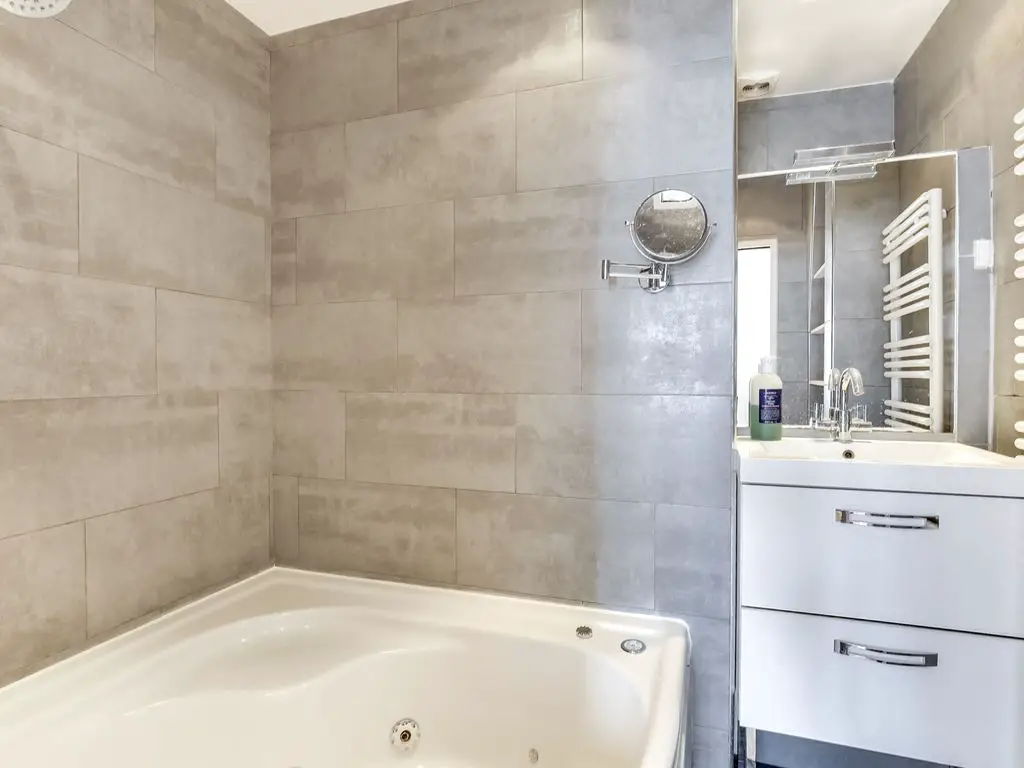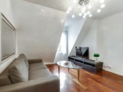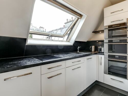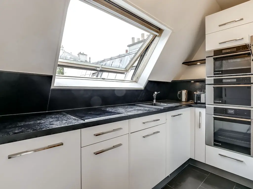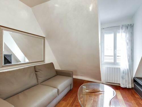 This charming apartment is located in the beautiful 7th arrondissement on the 6th floor of a secure, coded, residential apartment building without an elevator. Upon entering the apartment, you are greeted by the spacious living, kitchen and dining area. In the living area, you will find a comfortable sofa, which can be converted into a bed to accommodate an extra guest. Additional linens are provided for this bed. There is also a flat screen television with cable for your enjoyment. The flat as a unique view of the Eiffel Tower and rooftops of Paris.