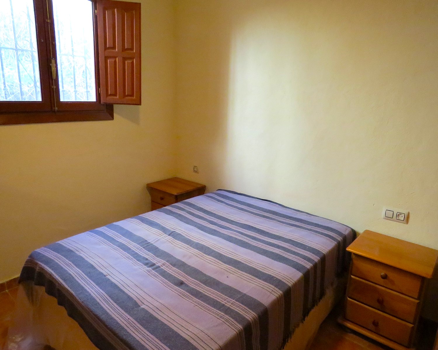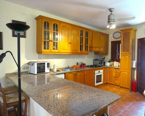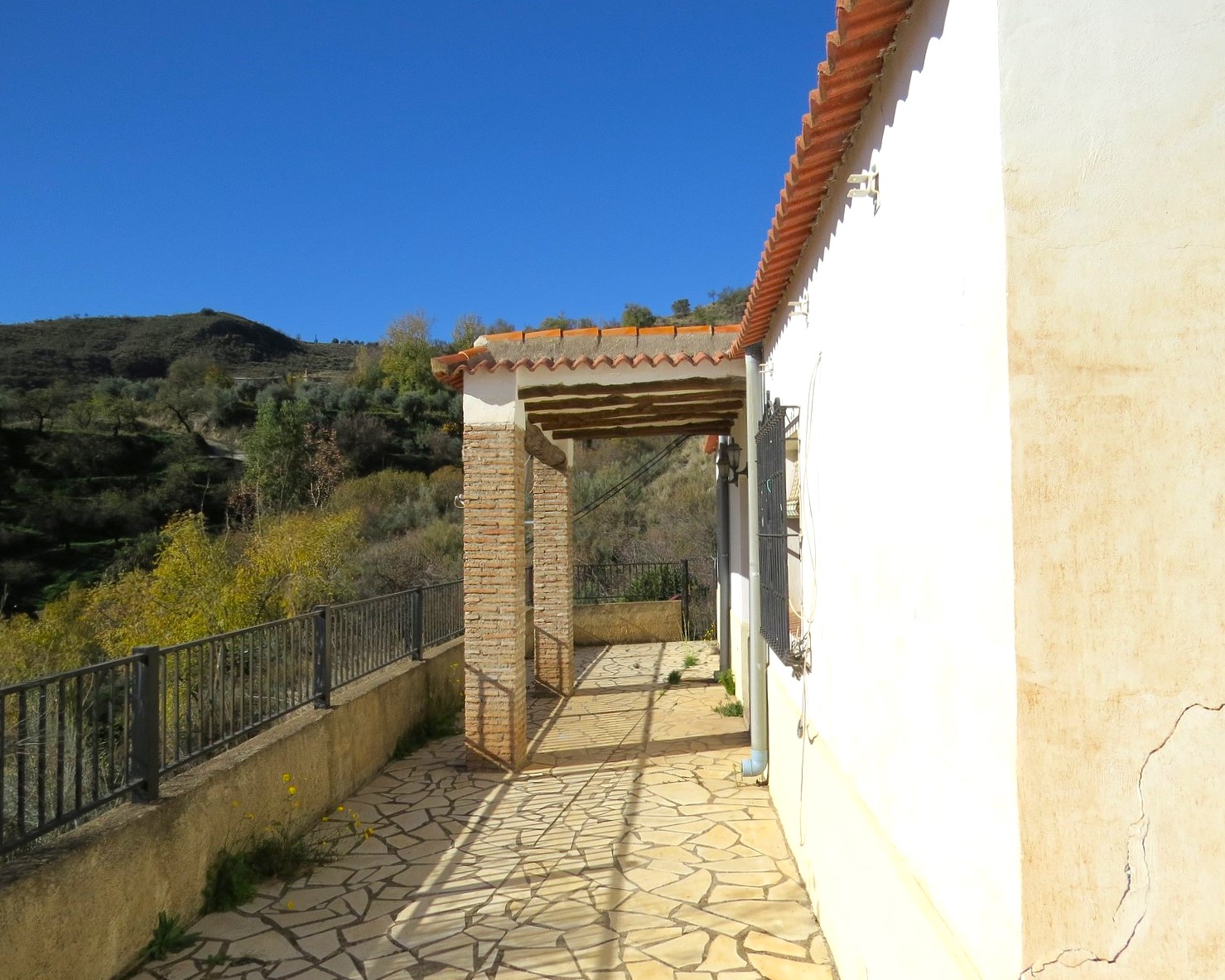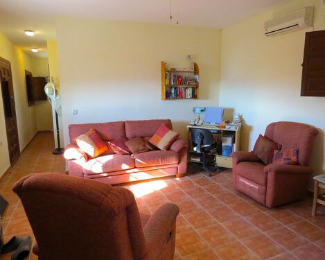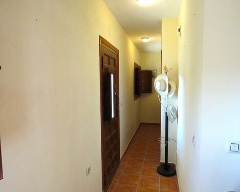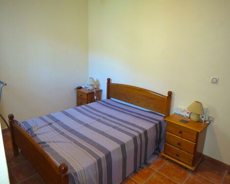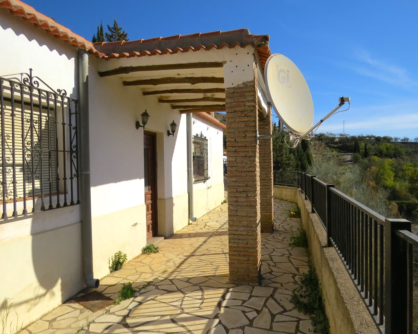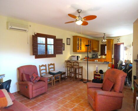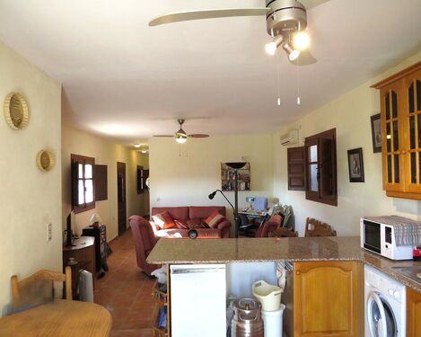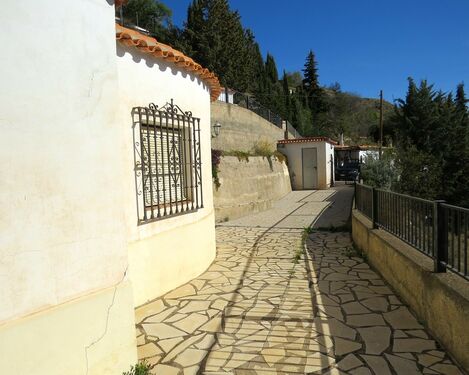 The property, constructed in 1998 is modern in style but rustic looking from the outside. It has a long paved terrace to the front of the property with a brick built storeroom near the entrance gates. There are two entrances to the house, one into the kitchen, the other into a corridor with the bedrooms and bathrooms off.