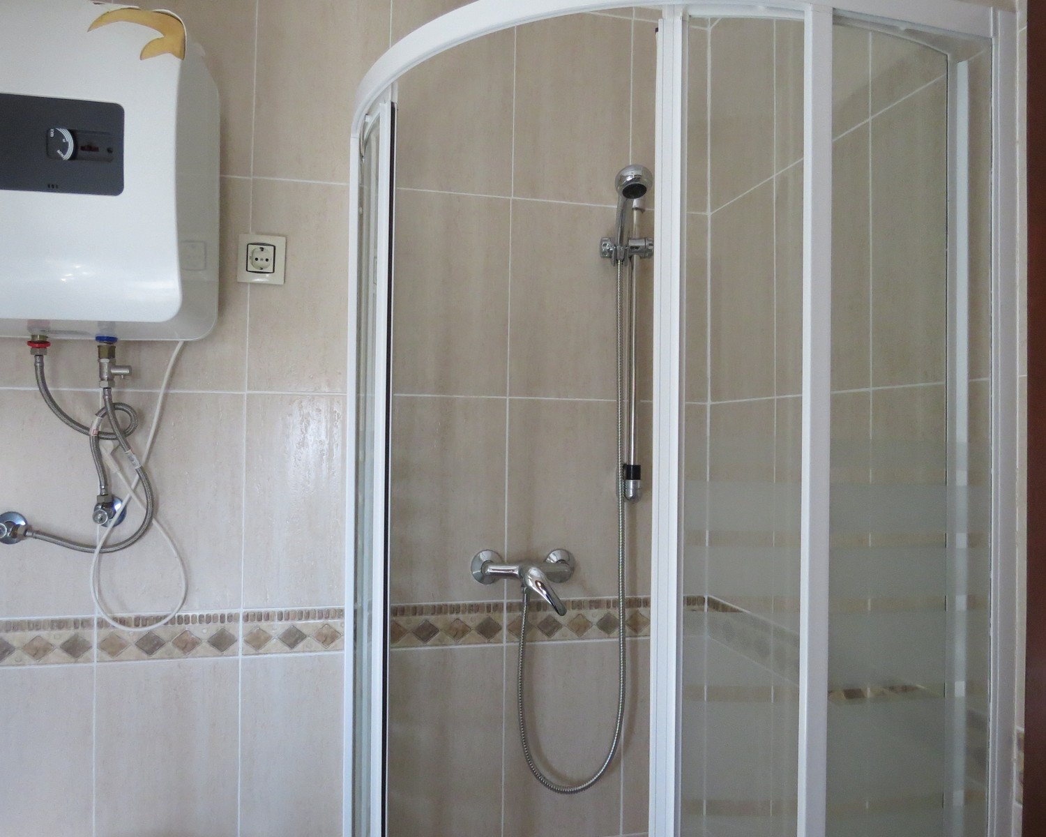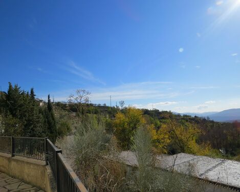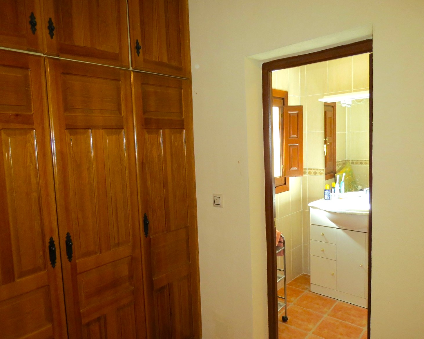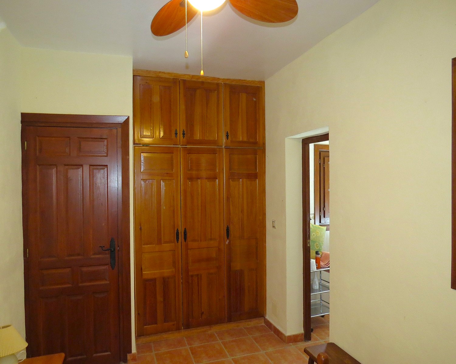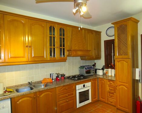 The property, constructed in 1998 is modern in style but rustic looking from the outside. It has a long paved terrace to the front of the property with a brick built storeroom near the entrance gates. There are two entrances to the house, one into the kitchen, the other into a corridor with the bedrooms and bathrooms off.