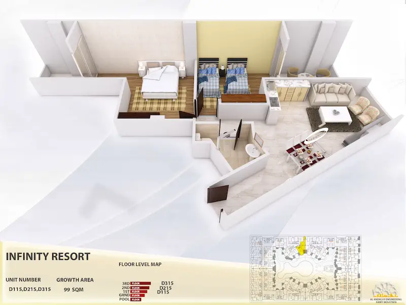 Discover a stunning 2-bedroom, 1-bathroom apartment located in the popular Aqua Infinity Resort, Hurghada, just minutes from the beach and key amenities. With 99 m² of space, 2 balconies (one with pool and garden views), and a bright, open layout, this apartment offers both comfort and investment potential. Now available with free fitted kitchen units and flexible payment plans in Euros or USD.