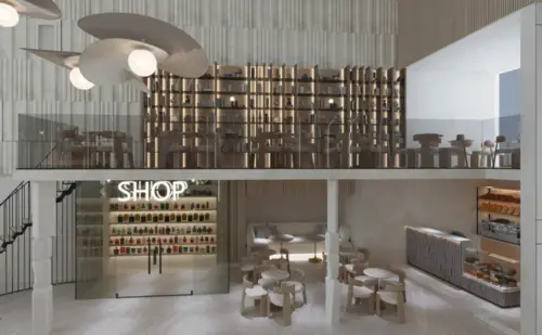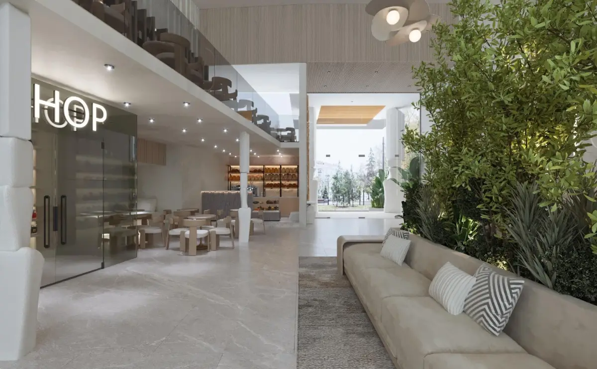 Commercial area with pharmacy, shops, and cafés