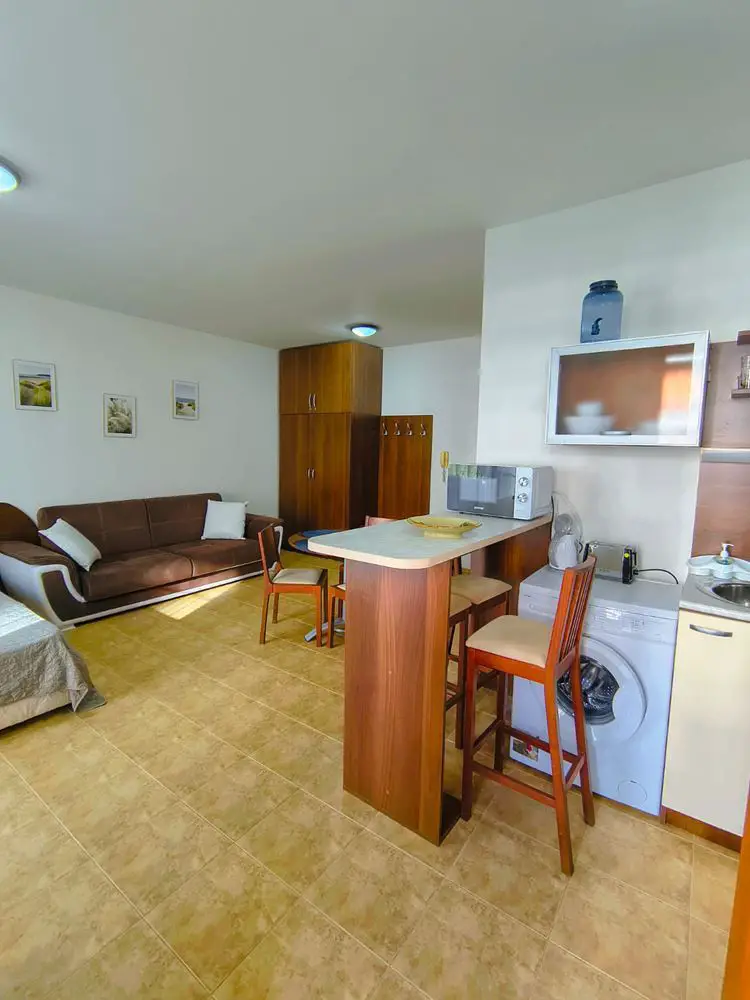 The apartment is fully furnished and ready to move in, making it suitable for both personal use and investment. The open-plan layout allows for a comfortable division into a sleeping area, living space, and kitchenette. Access to the balcony ensures natural light and fresh air, while the bathroom is practical and well-maintained. The building is equipped with an elevator, adding convenience for families with children or older residents.