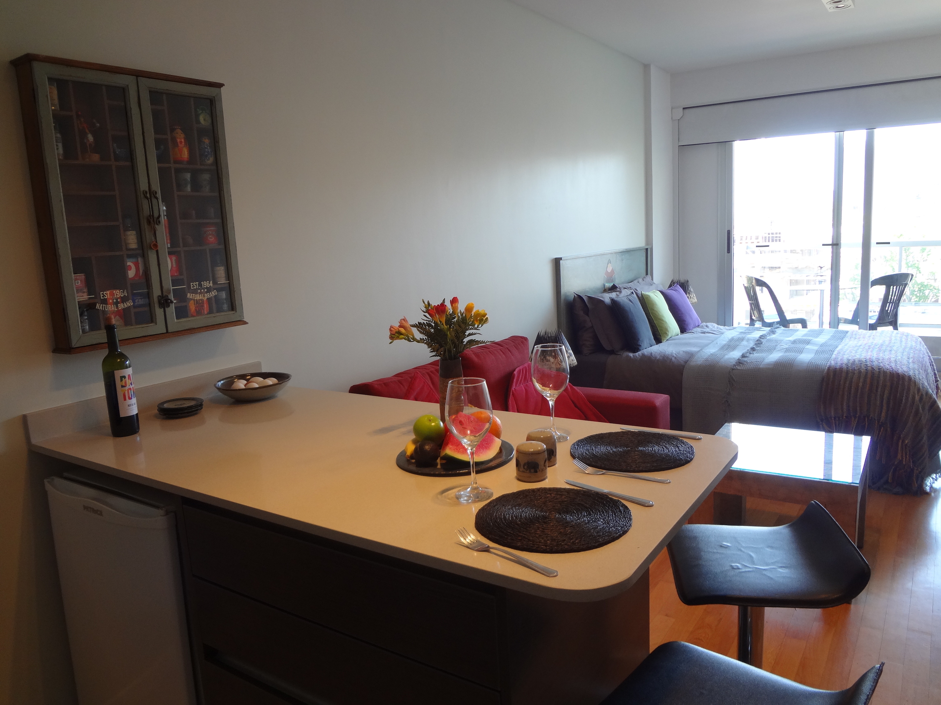 This is a very well appointed , front road facing seventh floor studio apartment in the trendy and fashionable Palermo Soho Buenos Aires . The studio is available to rent from the 1st April 2024 until the 15th May 2024 at a ' monthly rate ' of 1975 Euros inclusive . This is for a required minimum 30 day long rental rate . Alternatively , the studio can be rented at an inclusive rate of 76 Euros daily , for a minimum 4 day tenancy OR any other length of stay by agreement . The apartment is very well equipped with A/C , heating , fitted kitchen , full bathroom , balcony , 43 inch SMART full HD/LED TV / Cable / NETFLIX / Internet , safety box , all necessary bedding and towels , blackout and full width / height curtain etc ... The studio is a non smoking unit .