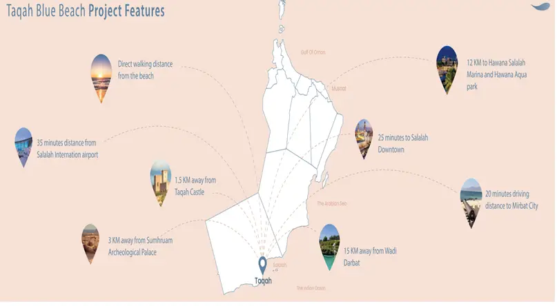 Immerse yourself in tranquility at Taqah Blue Beach at Taqah Beach where luxury meets serenity to experience a lifestyle beyond compare within our prestigious residential project. Discover breathtaking views of Salalah's silver beaches, iconic mountains and the vibrant cityscape.
