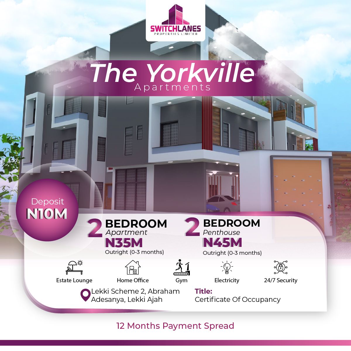 12 Months payment spread available with N10,000,000 Initial deposit.