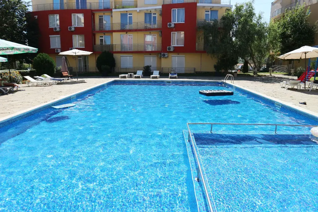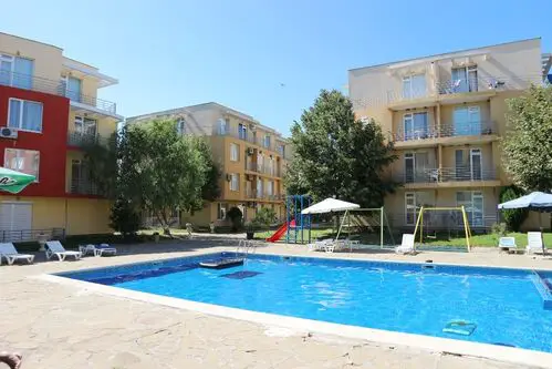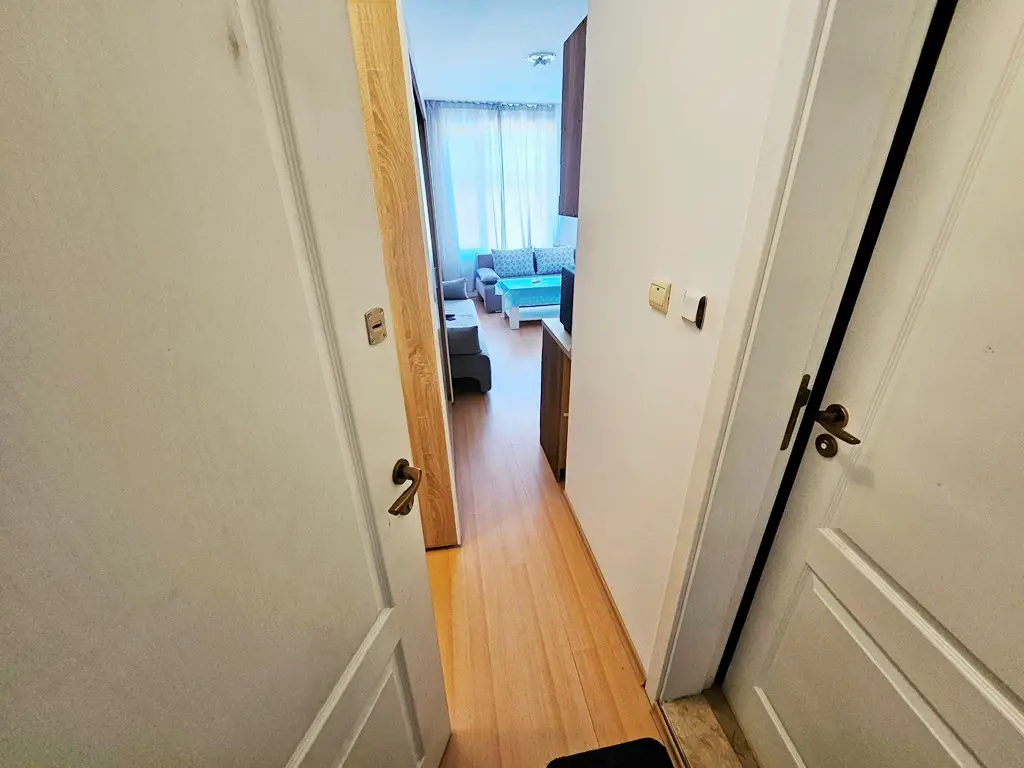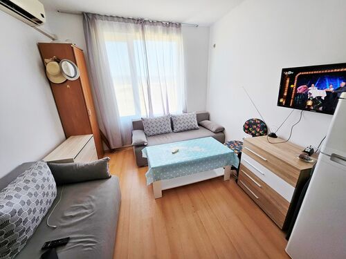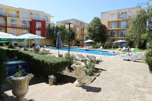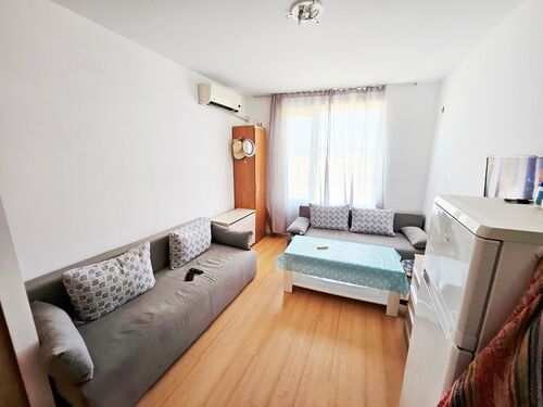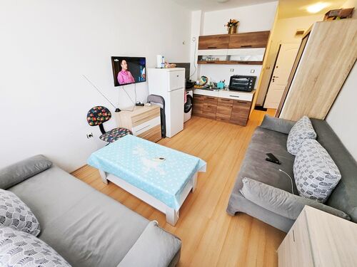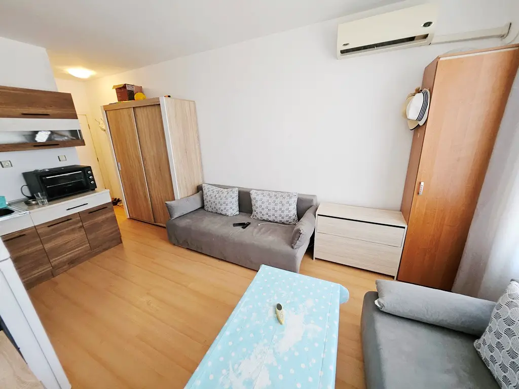 We offer for sale a cozy, warm studio in a complex with a nice territory. This residential complex is located on the outskirts of the most modern Bulgarian seaside resort - Sunny Beach and only 6 km from the UNESCO-protected Nessebar peninsula, 30 km from Burgas and the international airport and 90 km from Varna. Numerous attractions and entertainment opportunities are in the local area, while at the same time offering peace and quiet during the summer tourist season. The studio is located on the second floor and is in excellent condition. It is sold with the furniture and appliances without the stove and coffee machine. The annual maintenance fee is 580 euros. The complex has Act 15.
